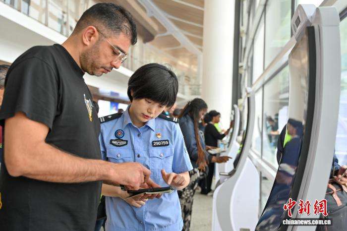 4月13日,白云边检站工作人员在广州白云国际机场T3航站楼协助外籍旅客办理入境手续。
