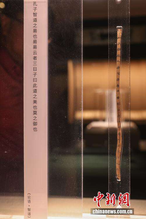 展出的一枚失传1800余年的齐《论语·智道》篇竹简,海昏侯墓出土《论语》竹简500余枚,有《智道》《雍也》《公冶长》《先进》《子路》等篇章。