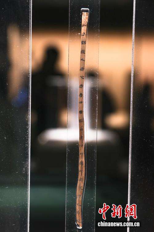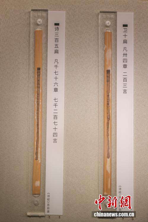 展出的一枚《诗经》总目录竹简(左),海昏侯墓中出土《诗经》竹简1200余枚,篇数与今本相同,证明海昏简《诗经》为全本《诗经》,是秦汉时期全本《诗经》的首次发现。