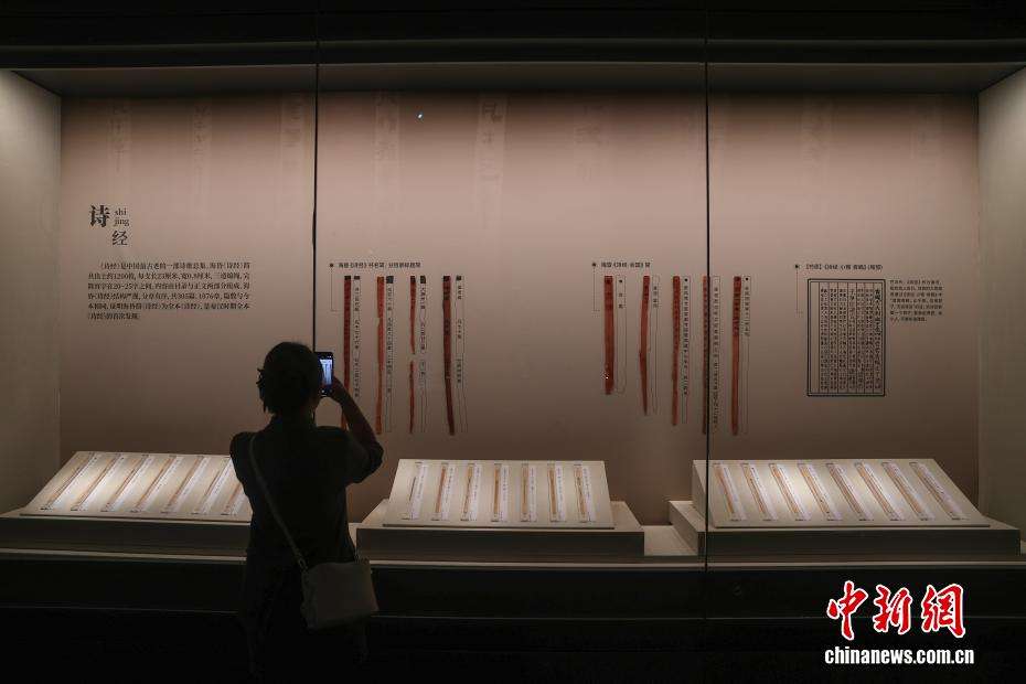观众在拍摄展出的《诗经》竹简,海昏侯墓中出土《诗经》竹简1200余枚,篇数与今本相同,证明海昏简《诗经》为全本《诗经》,是秦汉时期全本《诗经》的首次发现。