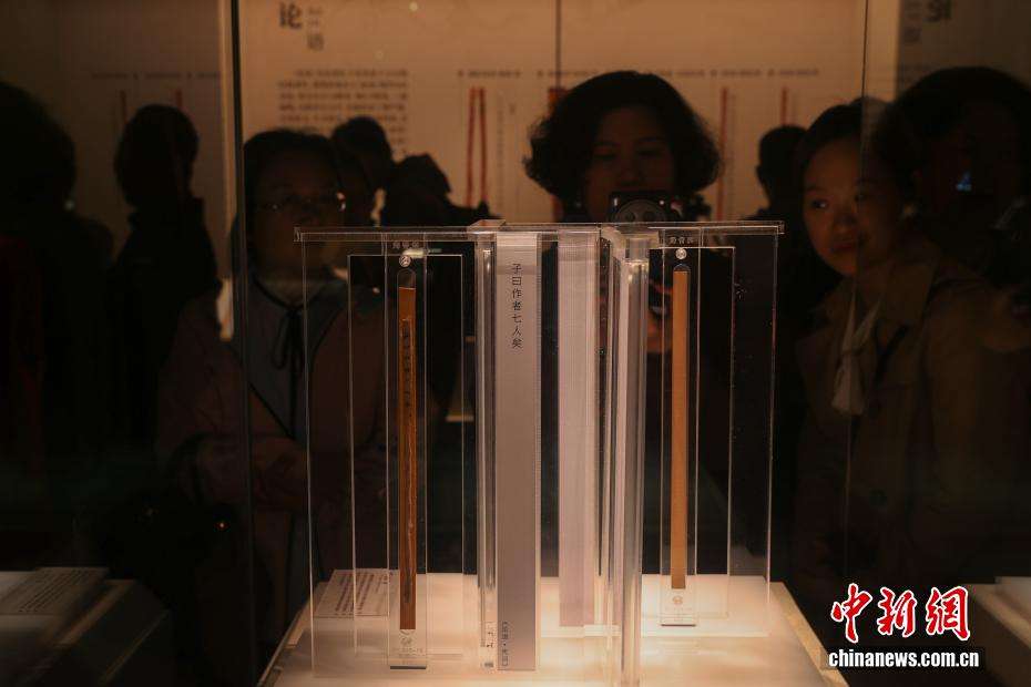 观众在观看展出的《论语》竹简。
