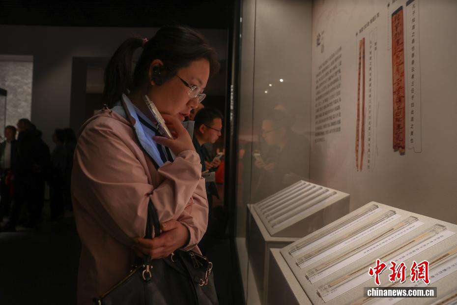 展出的一枚失传1800余年的齐《论语·智道》篇竹简吸引观众观看和拍照。