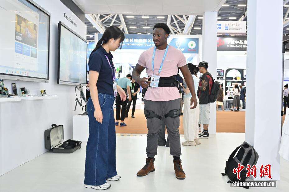 一名境外采购商在智能穿戴专区体验外骨骼机器人。