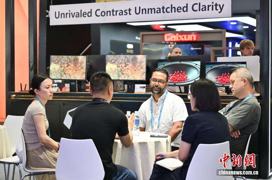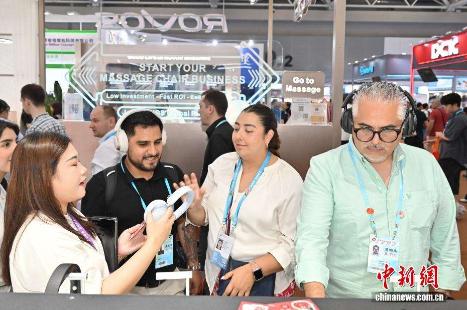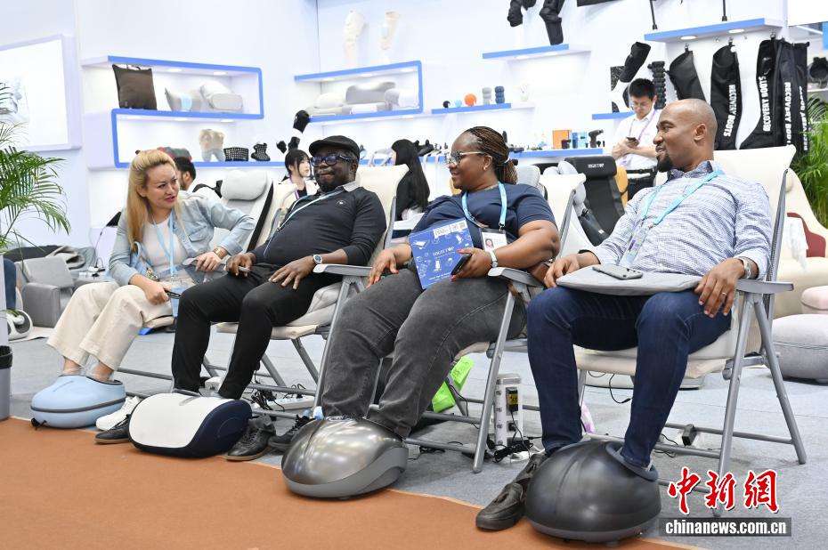 境外采购商在智能穿戴专区体验脚部按摩仪。