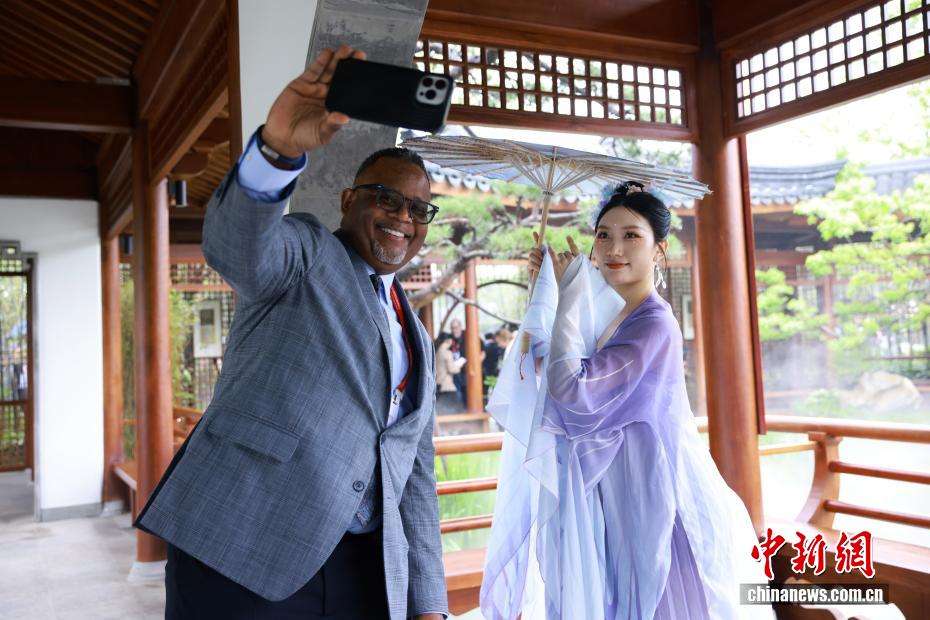 4月15日,杭州园内,国际友人与表演者合影留念。
