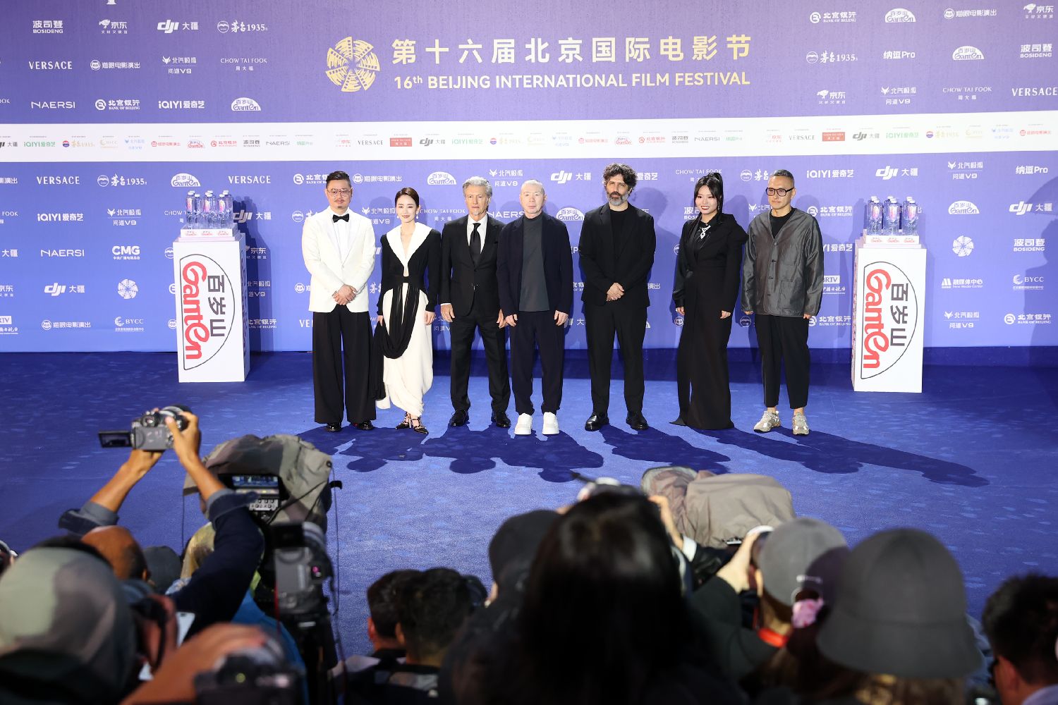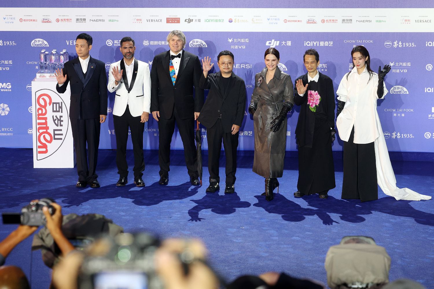 4月16日,第十六届北京国际电影节在北京雁栖湖国际会展中心开幕。本届电影节开幕入场仪式打破传统红毯定式,以京杭大运河碧波为灵感,将“运河蓝”定为主色调,中外电影人邀请观众一同开启光影之旅。 当日,本届“天坛奖”国际评奖委员会主席、国际知名演员朱丽叶・比诺什(右三),携评委会全体成员——中国导演毕赣(中)、法籍越南裔导演陈英雄(右二)、巴西导演加布里埃尔・马斯卡罗(左二)、英国作曲家西蒙・弗兰格伦(左三)、中国演员张小斐(右一)、中国演员张译(左一)集体登台。天坛奖是北京国际电影节的主竞赛单元奖项,用于表彰全球优秀电影作品。(李久骏/摄)