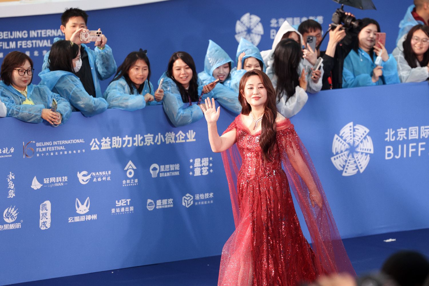 4月16日,中国演员马丽一身红裙亮相红毯。(李久骏/摄)