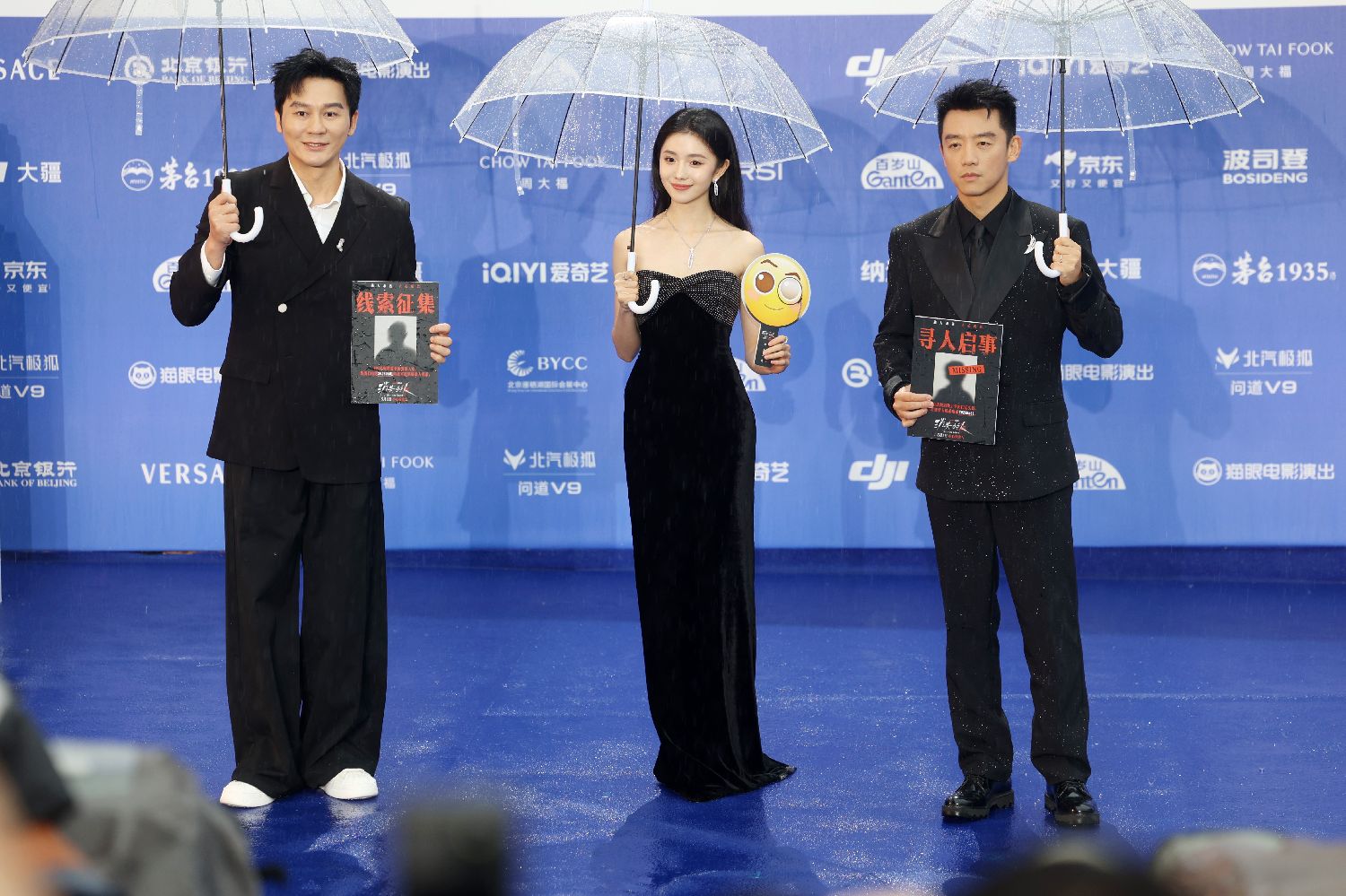 4月16日,悬疑电影《消失的人》主演李晨(左一)、刘浩存(中)和郑恺亮相红毯。(李久骏/摄)