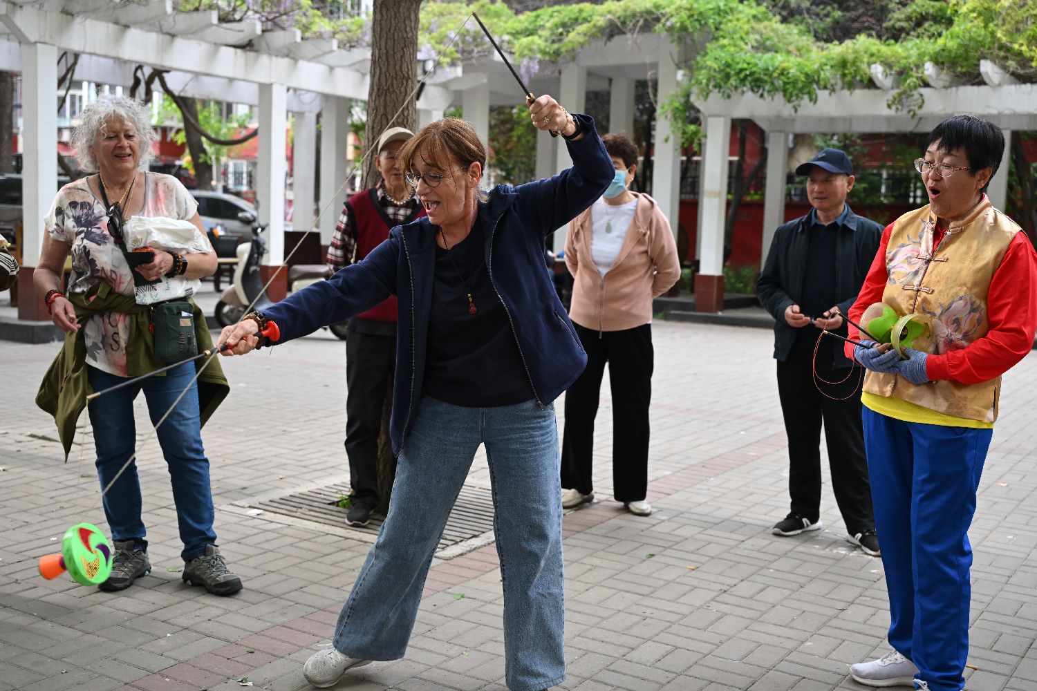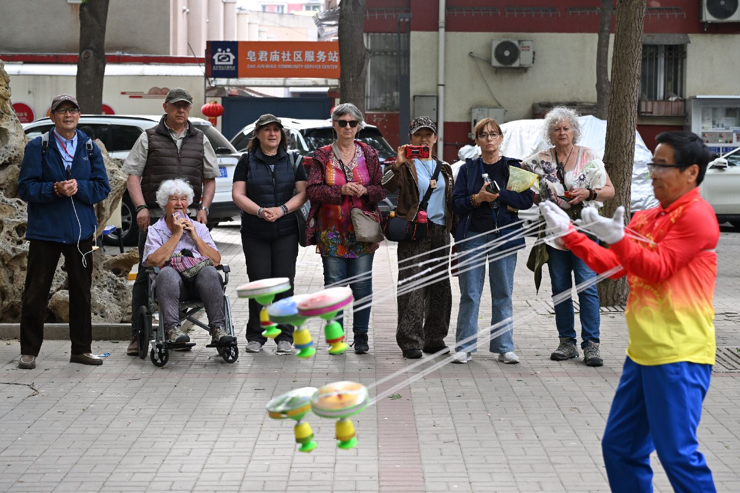4月21日,法国老人研学团在北京观看市民抖空竹表演。