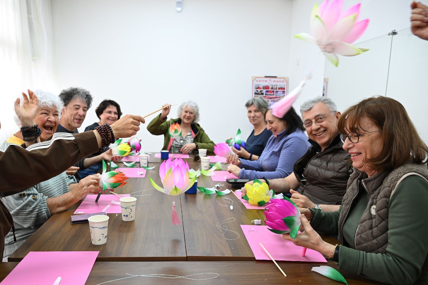 4月8日,法国老人研学团在北京体验非遗荷灯的制作。
