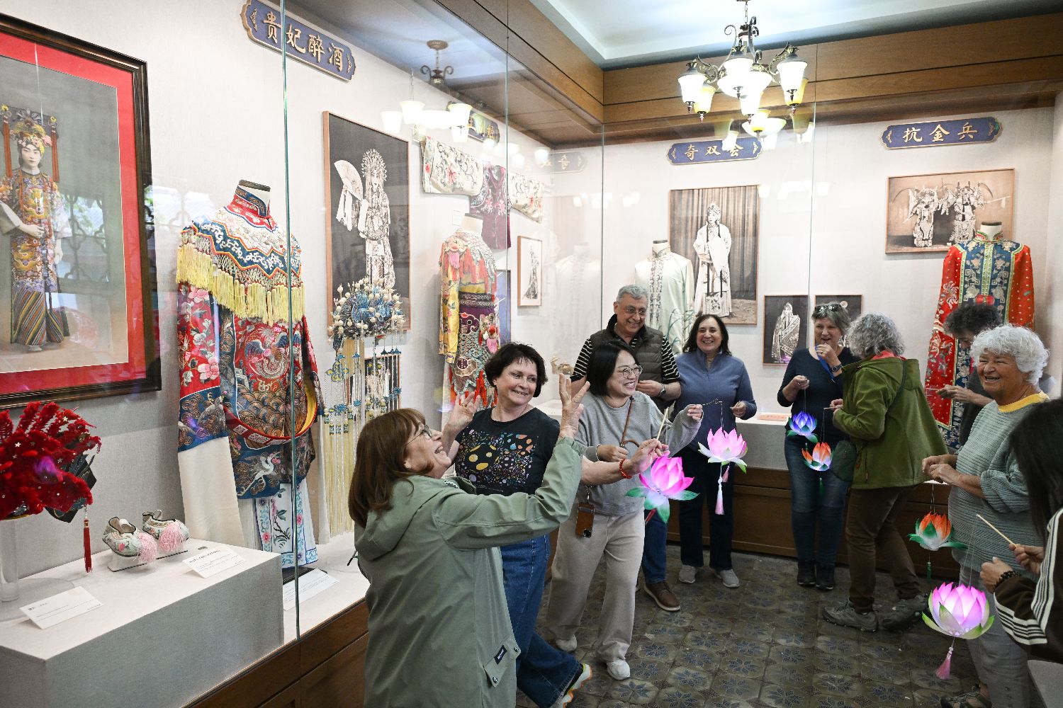 4月8日,法国老人研学团带着亲手制作的荷灯在北京梅兰芳纪念馆参观。