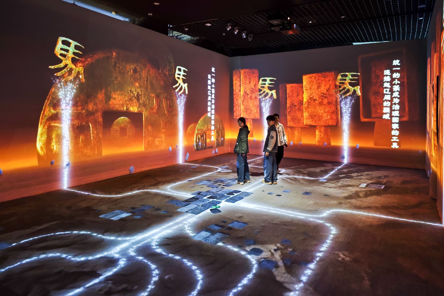 4月21日,天津博物馆首个全沉浸式数字主题展“契刻流光——甲骨文沉浸式互动体验数字大展”启幕。展览以天津博物馆馆藏珍贵甲骨文物为核心载体,通过全场景沉浸式数字技术、多维度互动体验,让沉睡三千余年的甲骨文字“活”起来,为观众打造一场跨越时空的中华古文字文明盛宴。图为观众参观甲骨文沉浸式互动体验数字展。