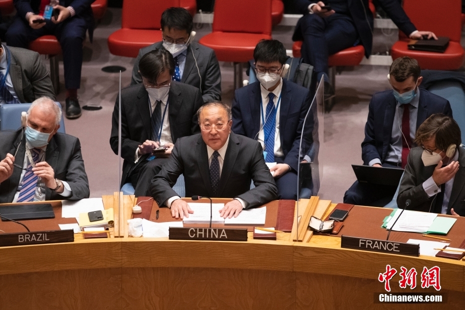 当地时间3月11日,联合国安理会在纽约联合国总部举行会议审议乌克兰生物安全问题。图为中国常驻联合国代表张军在会上阐述立场。中新社