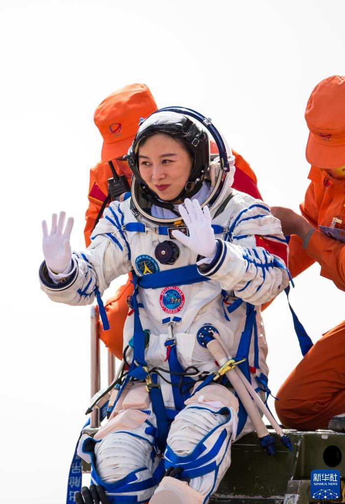 4月16日,神舟十三号载人飞船返回舱在东风着陆场成功着陆。这是女航天员王亚平安全顺利出舱。新华社