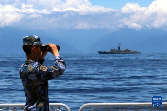 8月5日,中国人民解放军东部战区海军继续在台岛周边海域展开实战化训练。这是某舰官兵在瞭望观察。新华社
