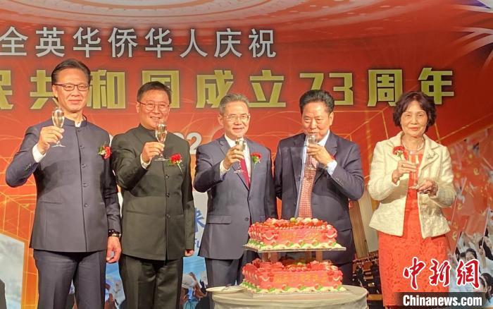 中国驻英大使郑泽光大使(中)带领嘉宾举杯共庆祖国73岁华诞。中新网