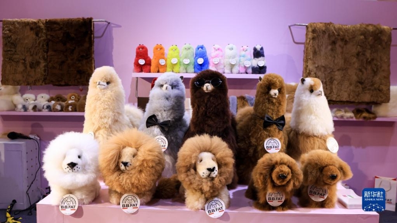 11月6日在第五届进博会秘鲁特瑞斯有限会社展台拍摄的羊驼毛玩偶。新华社
