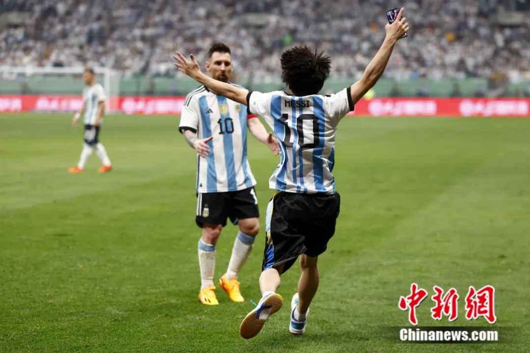 6月15日,比赛中一名球迷冲入赛场内拥抱阿根廷队球员梅西。中新网