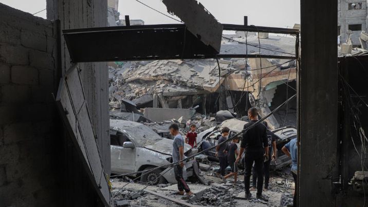 10月9日,在加沙城,人们查看被以色列空袭炸毁的建筑废墟。新华社