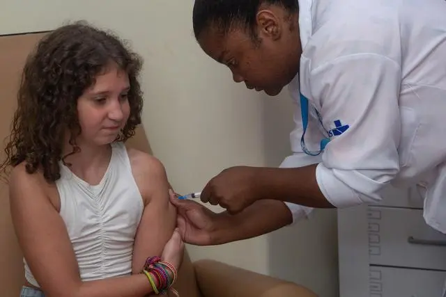 2月23日,在巴西里约热内卢博塔弗戈一家疫苗机构里,一名医护人员(右)为一名儿童接种登革热疫苗。 新华社