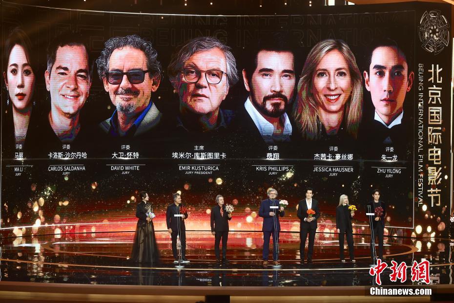 第十四届北京国际电影节“天坛奖”评委会阵容18日亮相。图为评委之一的巴西导演卡洛斯·沙尔丹哈(左二)站在舞台上。中新社