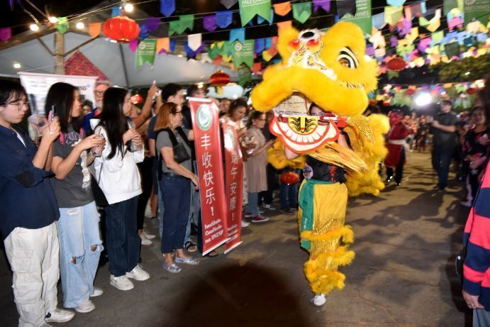 6月22日晚间,巴西圣保罗,圣保罗州立大学庆祝中国端午遇到巴西丰收节活动。图为巴西龙狮团体表演。中新社