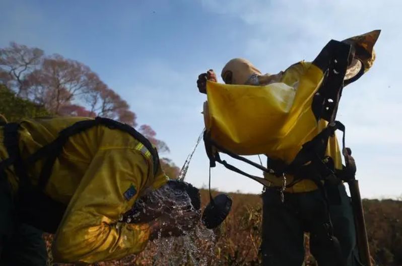 7月5日,消防员在巴西南马托格罗索州潘塔纳尔湿地参加灭火行动时降温。新华社