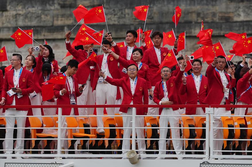 当地时间7月26日,第33届夏季奥运会开幕式在法国巴黎举行。图为中国代表团在开幕式上。中新社