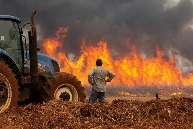 8月24日,一名男子在巴西圣保罗州迪蒙附近观看甘蔗田火情。新华社
