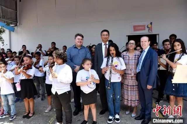 11月26日,巴西圣保罗佩鲁斯社区儿童民乐团演奏《友谊地久天长》。中国驻圣保罗总领事余鹏(二排左二)、巴西各界友人与小乐手合影。中新网