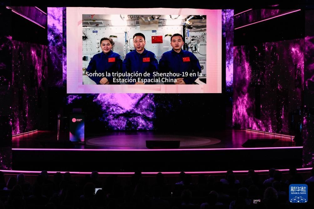 开幕式上,蔡旭哲、宋令东和王浩泽在中国空间站通过视频向大会参与者问好。他们说,中国空间站是开展空间科学研究的重要平台,也是开展国际合作的绝佳舞台。欢迎智利科学家更多参与中国空间站的研究项目,共同为人类和平利用太空作出贡献。期待更多拥有太空梦的智利和拉美年轻人加入探索宇宙奥秘的伟大事业。