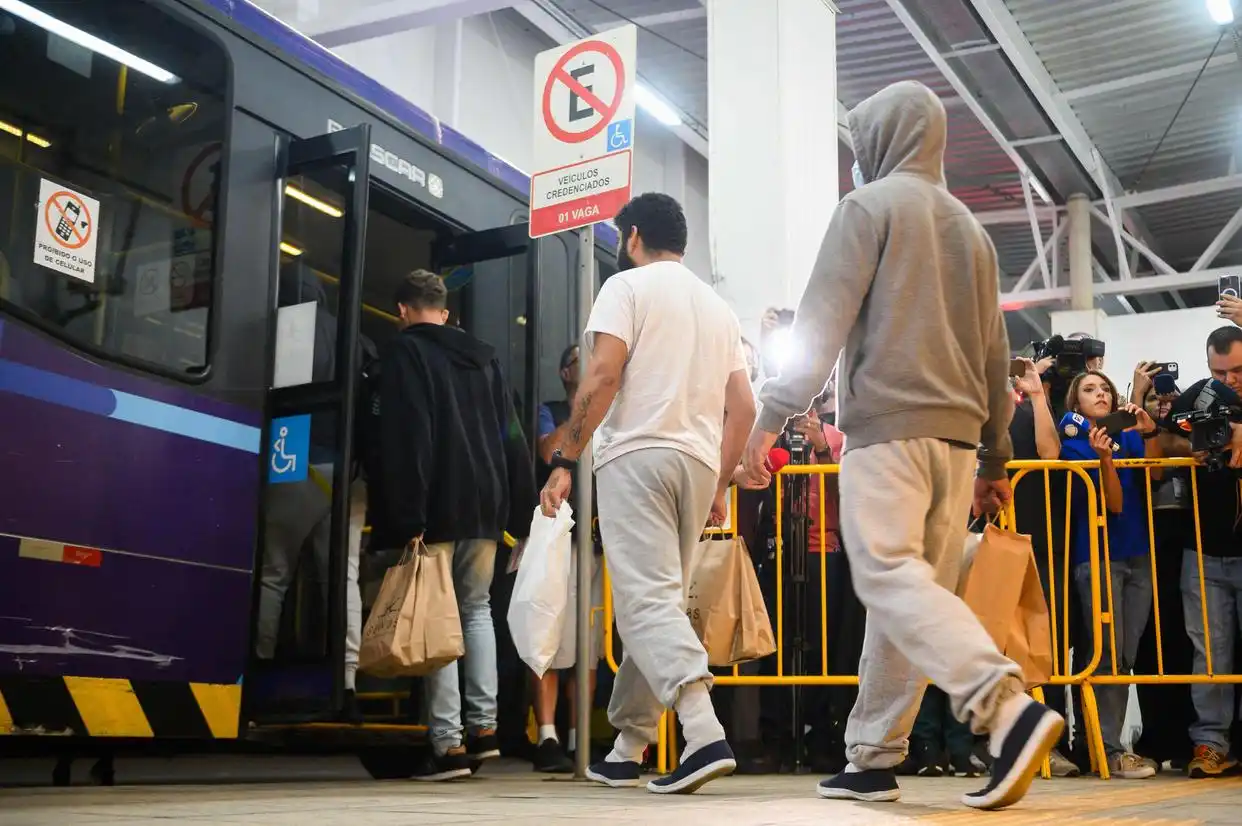 2月7日,被美国驱逐出境的巴西非法移民在巴西塞阿拉州福塔莱萨的国际机场乘坐客车。新华社