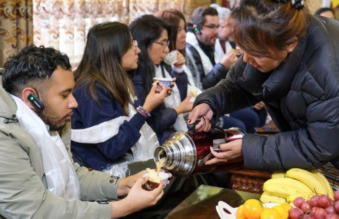 10月31日,来自哥伦比亚、智利、危地马拉等18个拉美国家的21名记者在拉萨居民家中参访,品尝高原甜茶、酥油茶等。中新社