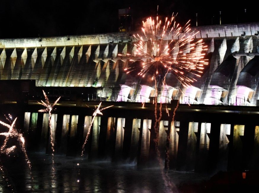 今年10月4日,巴西圣保罗亚洲文化中心在巴西瀑布城伊瓜苏北郊的“伊泰普中秋之夜”活动。当晚,伊泰普水电站点亮璀璨灯光,烟花映照夜空。中新社