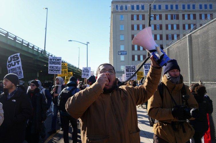1月4日,示威者在拘押委内瑞拉总统马杜罗的纽约大都会拘留中心外举行集会,抗议美国对委内瑞拉实施军事打击。中新社