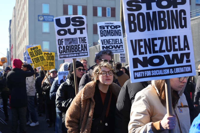 1月4日,示威者在拘押委内瑞拉总统马杜罗的纽约大都会拘留中心外举行集会,抗议美国对委内瑞拉实施军事打击。中新社