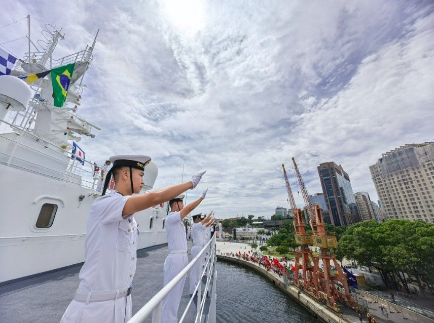 中新社报道,上午10时许,巴方在码头举行了隆重的欢迎仪式,巴海军军乐队演奏中巴两国国歌,巴西民众还准备了中国传统舞狮表演。巴西军政官员,中国驻巴西使领馆工作人员,以及当地民众、华侨华人和中资机构员工代表等在码头迎接。
