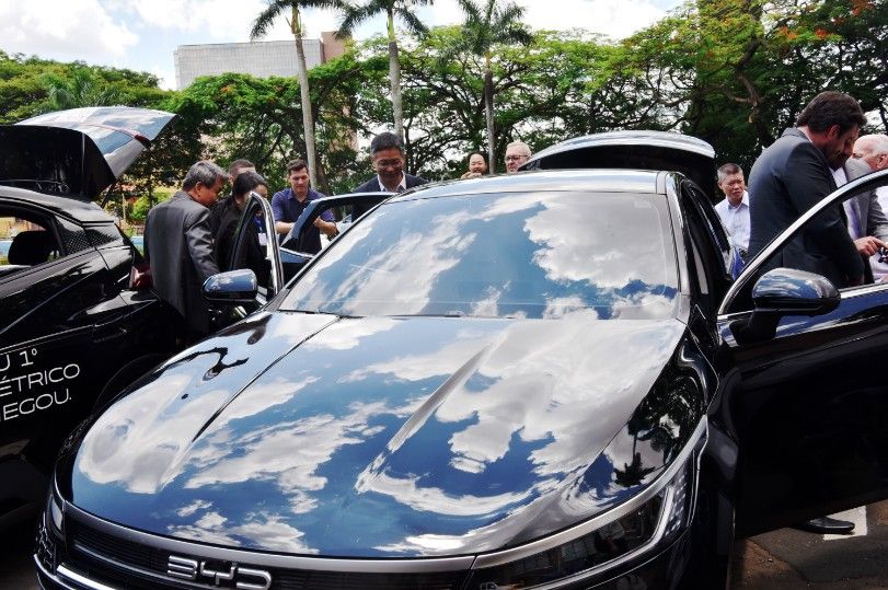 2025年12月6日,“中国文化日”活动在巴西圣保罗利美拉举办。图为新能源车辆倒影蓝天白云。中新社