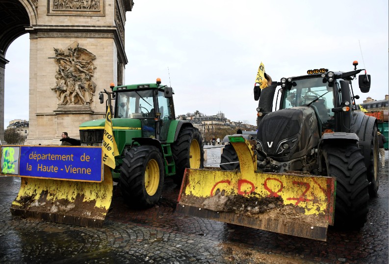 当地时间1月8日,法国农民在巴黎凯旋门利用农用车辆封堵道路,抗议欧盟-南方共同市场(南共市)自由贸易协定。中新社