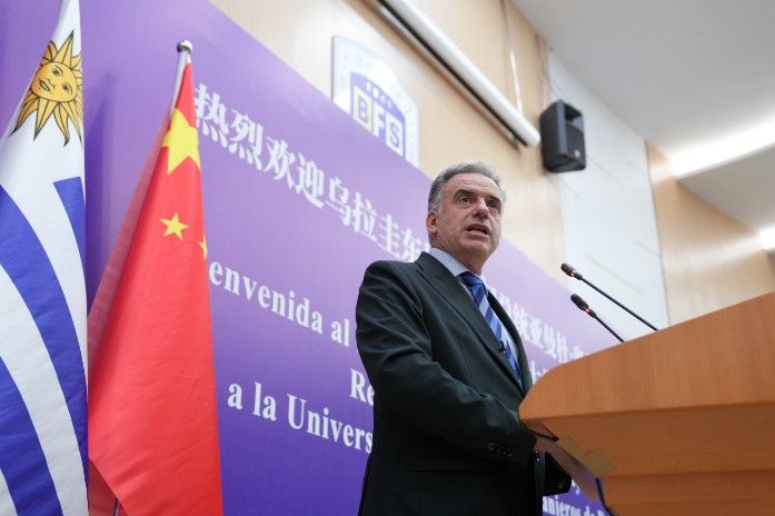 2月4日,乌拉圭总统奥尔西到访北京外国语大学并发表演讲。中新社