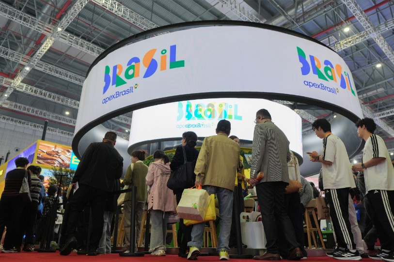 2025年11月9日,在第八届进博会国家综合展上,巴西馆人流众多。中新社