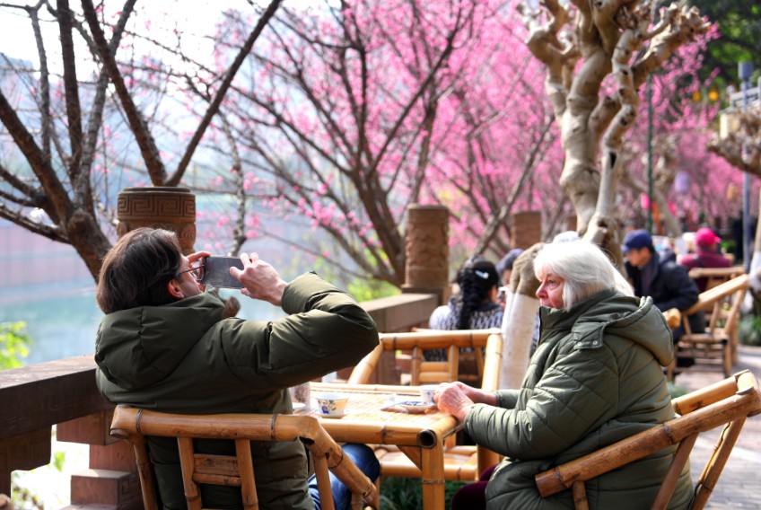 2月10日,海外游客在四川成都的梅花树下拍照、品茶。中新社