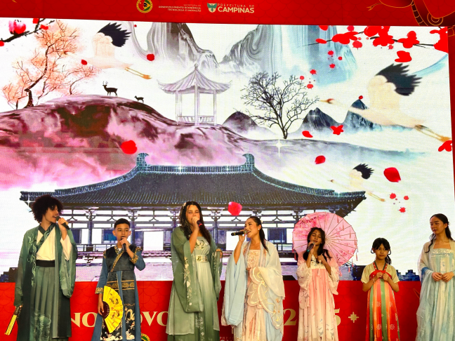 现场的文艺表演同样精彩纷呈。孔子学院的老师们身着各民族特色服饰,带来了舞蹈《美丽中国》,展现中华文化的多元之美。丁金贵老师以深情悠扬的美声演唱了《春风十万里》,赢得满堂喝彩。随后,巴西Anelo音乐学院的师生合唱了经典电视连续剧《新白娘子传奇》主题曲,让观众沉浸在美妙的旋律之中,也以此映衬蛇年主题。