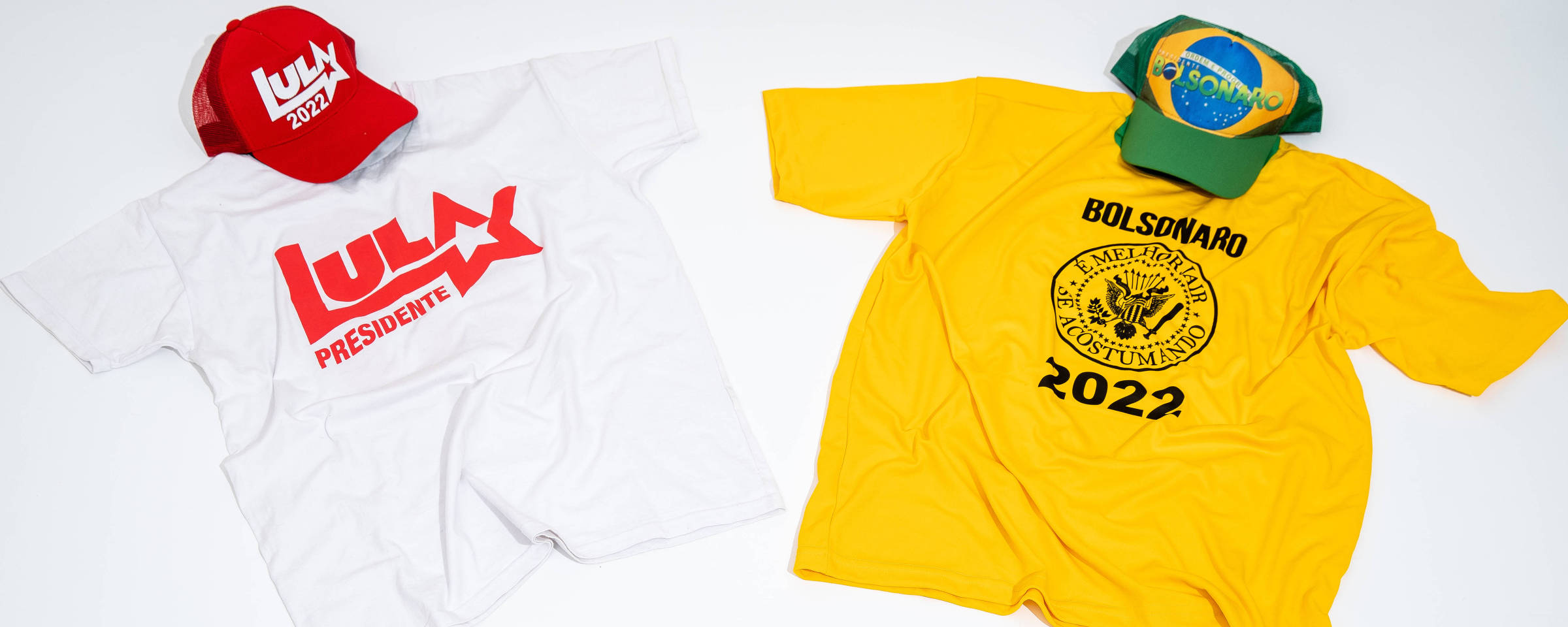 图为印有卢拉和博索纳罗代表元素的T恤和帽子。来源:巴西《圣保罗页报》
