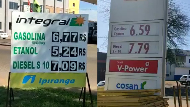 图为12日一家巴拉圭加油站(左)和一家巴西加油站(右)的燃油价格牌。巴西G1网站