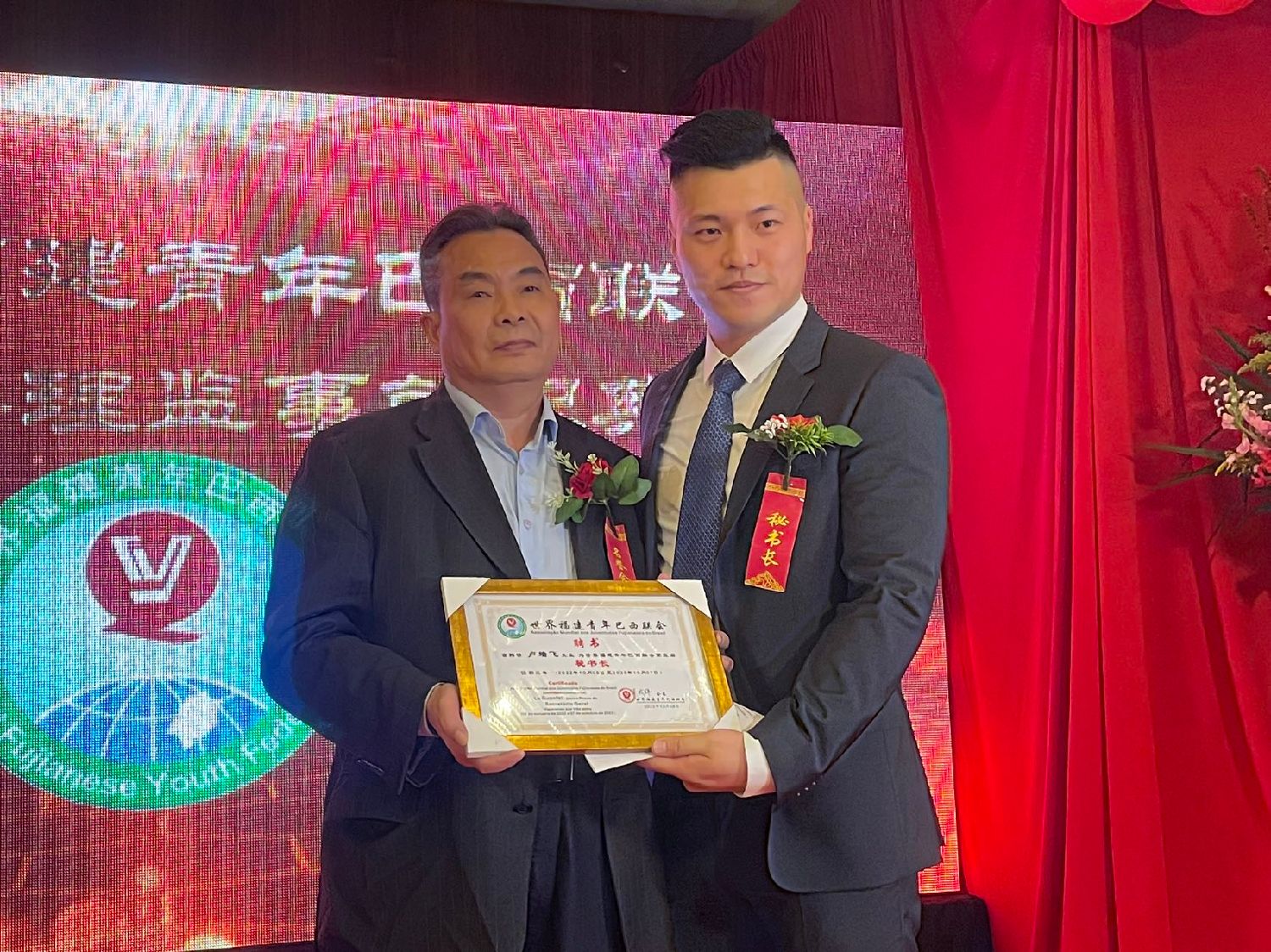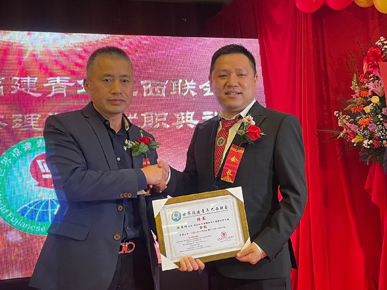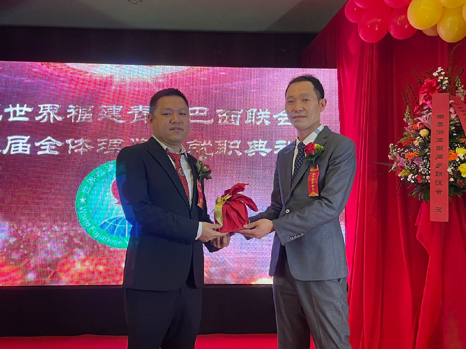 老会长林方耀与世界福建青年巴西联会第五届会长吴成纬交接会章。