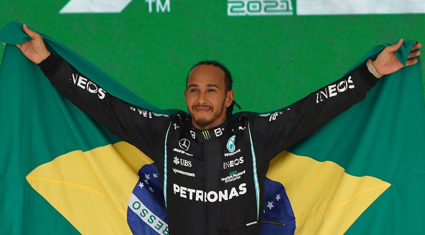 2021年,汉密尔顿在圣保罗市(São Paulo)的英特拉格斯赛道(Interlagos)获得了F1巴西大奖赛冠军。在颁奖仪式上,他模仿了巴西知名F1赛车手埃尔顿·塞纳(Ayrton Senna)的姿势,双手高举巴西国旗。