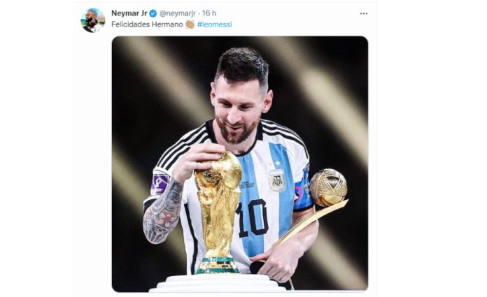 巴西网站“terra”报道,内马尔在推特上发布了一张梅西(Lionel Messi)在卡塔尔领奖台上抚摸大力神杯的照片,并配文称“祝贺你,我的好兄弟梅西”。截止19日,这条祝贺梅西带领阿根廷队赢得世界杯冠军的推文已获得超过220万次点赞。
