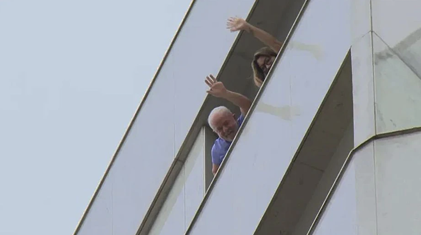 巴西总统卢拉和第一夫人在巴西利亚的酒店内向支持者挥手致意。《圣保罗州报》