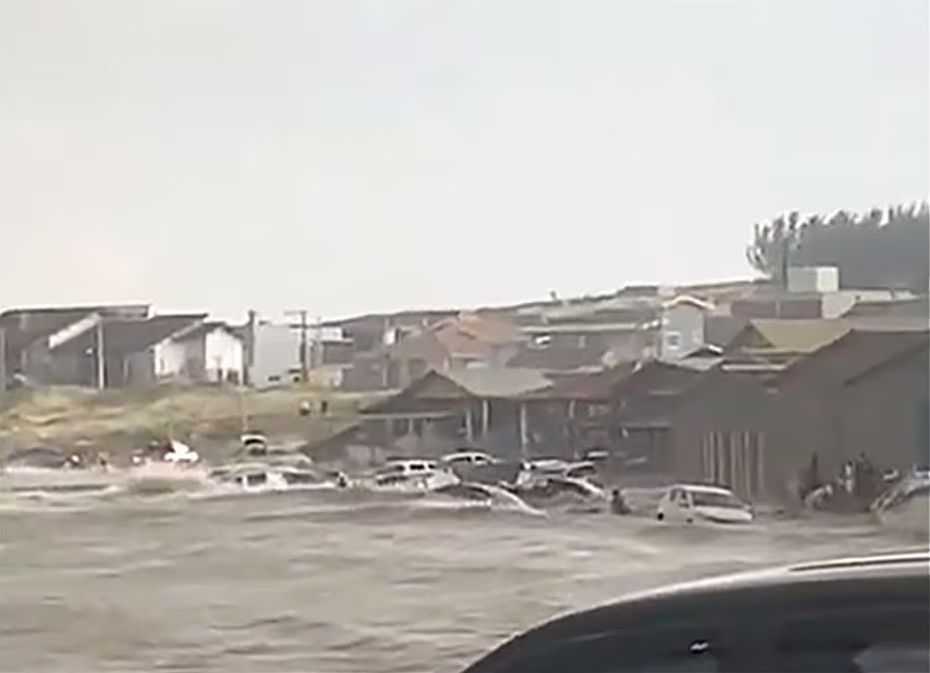 “气象海啸”突袭巴西圣卡塔琳娜州南部海岸,巨浪卷走多辆汽车。《圣保罗州报》